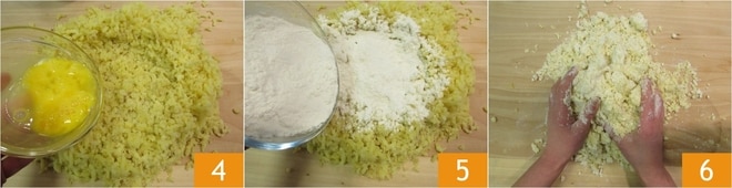 Versez au centre l'œuf légèrement battu 4, ajoutez la farine 5. Commencez ensuite à travailler la pâte avec vos mains 6,