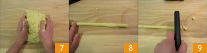 jusqu'à obtenir une pâte souple et compacte 7 : travaillez-la le moins possible, juste le nécessaire pour obtenir la consistance désirée : ainsi vous éviterez qu'ils ne durcissent trop à la cuisson. Prélevez un peu de pâte et étalez-la pour obtenir un boudin d'environ 1-2 cm d'épaisseur 8, selon la taille que vous souhaitez pour les gnocchis. Si la pâte est légèrement trop molle, aidez-vous avec de la semoule pour la travailler. Coupez les boudins en morceaux d'environ 1,5 cm 9,