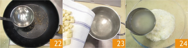 en ajoutant une louche d'eau chaude 22. Vous pouvez maintenant cuire les gnocchis 23. Ils ne mettront que quelques minutes à cuire : ils seront prêts dès qu'ils remonteront à la surface. Pendant que vous attendez la cuisson des gnocchis, prélevez environ une louche d'eau de cuisson et versez-la dans le bol avec le pecorino 24.