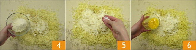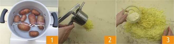 Pour préparer les gnocchis de la Val Varaita, commencez par faire bouillir les pommes de terre pendant 30-40 minutes, jusqu'à ce qu'elles soient tendres, piquez-les avec une fourchette pour vérifier la cuisson 1. Passez les pommes de terre bouillies encore chaudes au presse-purée 2, puis étalez-les sur le plan de travail. Ajoutez le Parmigiano Reggiano DOP 3.