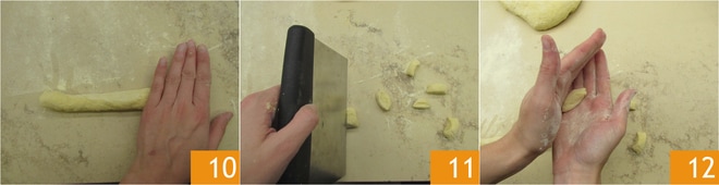 Formez des boudins 10, puis des morceaux de 1,5 cm 11 et donnez-leur la forme classique des ravioles 12.