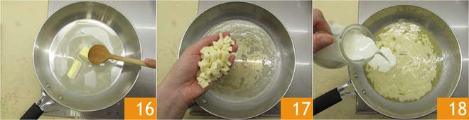 Occupez-vous maintenant de l'assaisonnement : faites fondre le beurre dans une poêle 16 jusqu'à ce qu'il devienne noisette et prenne une belle couleur ambrée. Ajoutez ensuite le Raschera 17, mélangez une trentaine de secondes, puis ajoutez la crème 18.