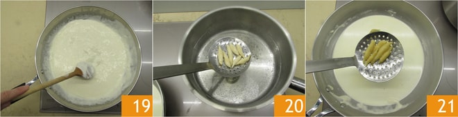 Cuisinez à feu doux jusqu'à ce que le fromage soit fondu 19. Faites ensuite cuire les gnocchis dans de l'eau bouillante salée 20 et, dès qu'ils remontent à la surface, égouttez-les directement dans l'assaisonnement 21, en les laissant s'imprégner encore une minute dans la poêle.