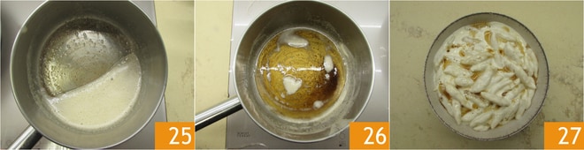 Ajoutez de l'eau de cuisson si nécessaire 22 et mélangez 23. En attendant, préparez le beurre noisette : chauffez le beurre à feu doux 24.