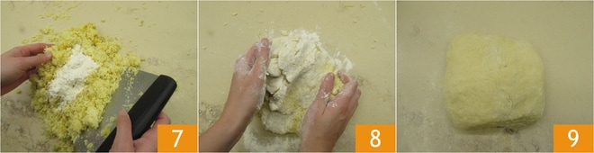 Commencez à pétrir 7 en ajoutant petit à petit la farine 8. Vous devez obtenir une pâte souple mais pas collante 9.