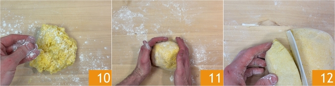 Ajoutez une pincée de farine 10 et pétrissez jusqu'à obtenir une boule homogène et plutôt compacte 11. Si elle s'avère trop molle ou collante, vous pouvez ajouter encore un peu de farine. Divisez la pâte en plusieurs portions en utilisant un racloir 12.