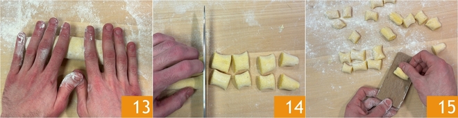 Prenez le premier morceau de pâte et, avec les mains, formez un petit boudin d'environ 1-2 cm de diamètre, selon la taille souhaitée 13. Coupez-les ensuite avec un couteau ou un racloir en tronçons d'environ 2 cm, comme pour les gnocchis classiques 14. Enfin, marquez les gnocchis à l'aide de l'outil prévu en le farinant bien 15. Transférez-les au fur et à mesure sur un torchon bien fariné et poursuivez ainsi jusqu'à épuisement de la pâte. Vos gnocchis de polenta sont prêts à être cuits et assaisonnés comme vous le préférez !