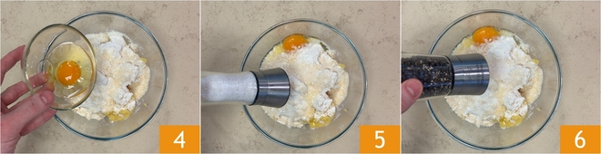 Ajoutez l'œuf 4, puis ajustez l'assaisonnement en sel 5 et en poivre 6.