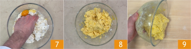 Travaillez la préparation avec les mains 7 jusqu'à ce que les œufs soient bien absorbés 8, puis transférez la pâte sur le plan de travail 9.