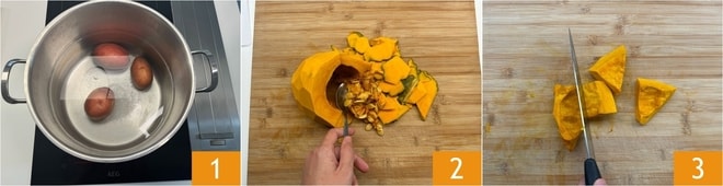 Pour préparer les gnocchis de potiron, commencez par laver très bien les pommes de terre jusqu'à ce qu'elles soient complètement exemptes de terre, puis placez-les dans une grande casserole d'eau froide salée, sans les éplucher 1. Mettez sur le feu et portez à ébullition. Pendant ce temps, prenez le potiron, épluchez-le et enlevez les graines et les filaments internes 3. Coupez le potiron en morceaux, vous devrez obtenir 250 g de pulpe 3.