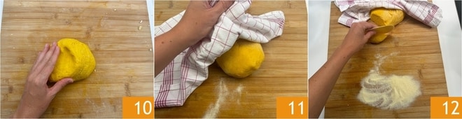 Travaillez encore brièvement, juste le temps que la pâte devienne homogène, douce mais assez ferme 10. Nettoyez le plan et saupoudrez soigneusement le pâton avec de la semoule, puis couvrez-le avec un torchon pour ne pas le faire sécher 11. Utilisez ensuite le grattoir pour en détacher un petit morceau à la fois 12.