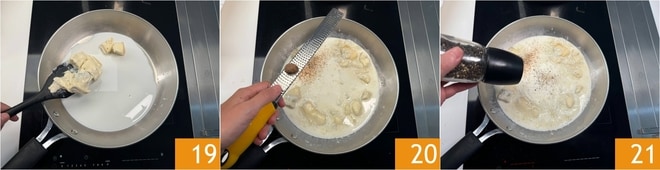 Dans une poêle, versez le lait et chauffez-le, puis ajoutez le gorgonzola 19. Ajoutez une pincée de noix de muscade 20, une pincée de sel et de poivre 21.