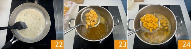 Mélangez jusqu'à ce que le fromage soit fondu 22, puis éteignez le feu et laissez épaissir. Ajustez l'eau en sel si nécessaire et dès qu'elle bout, plongez les gnocchis en vous aidant d'une écumoire 23. Lorsqu'ils remontent à la surface, égouttez-les 24.