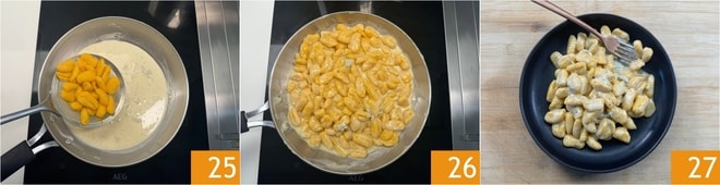 Transférez les gnocchis dans la crème de gorgonzola 25 et faites-les sauter à feu éteint 26. Servez immédiatement vos gnocchis de potiron avec crème de gorgonzola 27 !