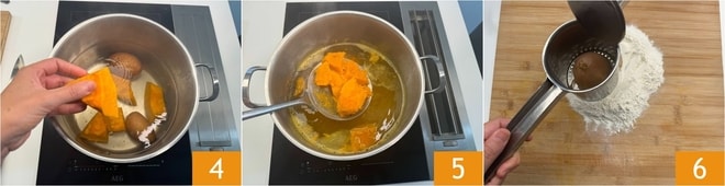 Après les 20 premières minutes de cuisson des pommes de terre, ajoutez le potiron 4 et laissez cuire encore 15 minutes. À la fin de ce temps, piquez avec une fourchette à la fois le potiron et les pommes de terre pour vérifier qu'ils sont de consistance tendre mais encore assez ferme ; surtout le potiron ne devra pas se défaire. Égouttez ensuite le potiron 5 et transférez-le dans une passoire. Égouttez ensuite aussi les pommes de terre. Ne jetez pas l'eau qui pourra être réutilisée pour la cuisson des gnocchis. Sur le plan de travail, formez une fontaine avec la farine et à l'aide de l'ustensile approprié, écrasez au centre de la farine les pommes de terre encore chaudes 6.