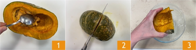 Pour préparer les gnocchis de potiron sans gluten, commencez par nettoyer la citrouille des graines et filaments internes 1, puis coupez-la en deux 2 et placez-la dans un bol couvert de film plastique. Faites cuire au micro-ondes pendant 10 minutes à 800 Watts 3.