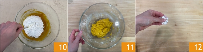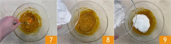 Mélangez bien jusqu'à ce que l'œuf soit complètement absorbé 7, puis ajoutez la farine de riz 8 et l'amidon de maïs 9.