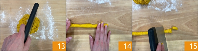 Divisez la pâte en portions plus petites à l'aide d'une corne 13 et formez des boudins 14, puis découpez des morceaux de 1 cm 15.