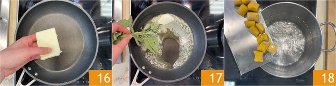 Après avoir formé tous les gnocchis, procédez à la cuisson : faites fondre le beurre 16 avec les feuilles de sauge 17 dans une poêle. Faites cuire les gnocchis dans de l'eau bouillante salée 18.