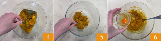 Une fois cuite, prélevez la chair de la citrouille avec une cuillère 4 et laissez refroidir. À ce stade, écrasez la citrouille avec une fourchette 5, puis ajoutez l'œuf 6.