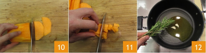 À ce stade, occupez-vous de la sauce. Prenez la courge déjà nettoyée et coupez-la d'abord en tranches 10 puis en dés d'environ 1 cm 11. Dans une poêle, versez un filet d'huile et ajoutez une gousse d'ail coupée en deux. Ajoutez les brins de romarin 12