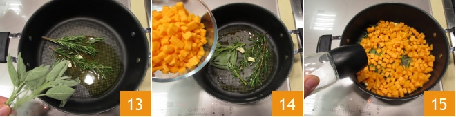 et ceux de sauge 13. Laissez infuser à feu moyen pendant 2-3 minutes, puis ajoutez la courge 14. Assaisonnez de sel 15