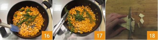 et mélangez bien 16. Attendez quelques minutes, puis retirez les brins de romarin 17, la sauge et l'ail. Faites cuire la courge pendant environ 12 minutes au total. Pendant ce temps, coupez le fromage en cubes 18.