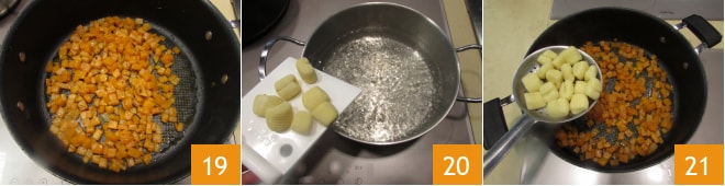 Quand la courge est prête 19, faites cuire les gnocchis peu à peu dans beaucoup d'eau bouillante salée à votre goût 20. Dès qu'ils sont prêts, égouttez-les avec une écumoire et transférez-les dans la poêle avec la courge 21.