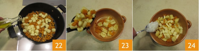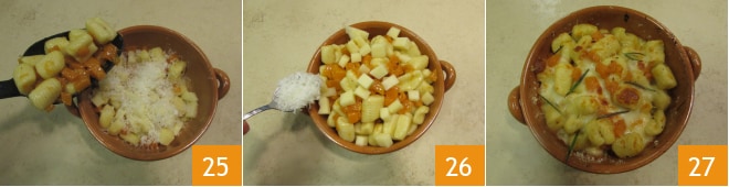 Ajoutez un filet d'huile 22 et mélangez. Maintenant, composez les cocottes. Vous en obtiendrez 4 en tout. Disposez à la base une première couche de gnocchis à la courge 23, ajoutez des cubes de tomme et du Grana Padano DOP râpé 24.