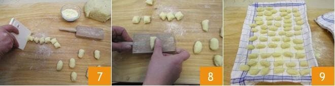 Puis coupez les rouleaux en morceaux 7 et en appuyant légèrement avec votre pouce, faites-les glisser sur le riga gnocchi pour obtenir la forme classique 8. Si vous n'avez pas de riga gnocchi, vous pouvez utiliser une fourchette et les faire glisser sur les dents ; là aussi, utilisez de la semoule pour éviter qu'ils ne collent. Au fur et à mesure que vous préparez les gnocchis de pommes de terre, disposez-les sur un plateau avec un torchon légèrement fariné, bien espacés les uns des autres 9.