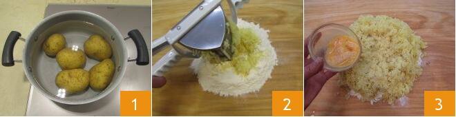 Pour préparer les gnocchis gratinés à la courge et à la tomme, commencez par les faire bouillir. Placez-les dans une casserole avec de l'eau froide 1 et allumez le feu. À partir du moment où l'eau commence à bouillir, comptez environ 30 à 40 minutes, selon leur taille. Épluchez-les pendant qu'elles sont encore chaudes et écrasez-les immédiatement sur la farine que vous aurez déposée sur le plan de travail 2. Ajoutez ensuite l'œuf légèrement battu avec une pincée de sel 3