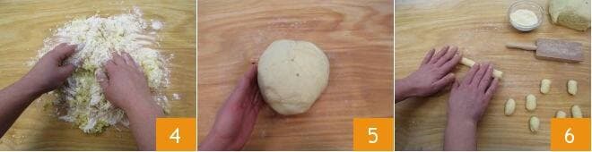 et mélangez le tout à la main 4 jusqu'à obtenir une pâte souple mais compacte 5. N'oubliez pas qu'en les travaillant trop, les gnocchis deviendront durs lors de la cuisson, alors contentez-vous de pétrir le strict nécessaire. Prélevez une partie de la pâte et étalez-la avec le bout des doigts pour obtenir des bigolis, c'est-à-dire des rouleaux, épais de 2 centimètres 6 ; pour cela, aidez-vous en farinant de temps en temps le plan de travail avec de la semoule. Pendant ce temps, couvrez la pâte restante avec un torchon pour éviter qu'elle ne sèche.