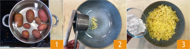 Pour préparer les gnocchis sans gluten, commencez par faire cuire les pommes de terre rouges dans une casserole en partant d'une grande quantité d'eau froide. Faites cuire environ 40 minutes après ébullition ou jusqu'à ce que la fourchette pénètre facilement au cœur 1. Écrasez les pommes de terre tant qu'elles sont encore chaudes (la peau restera à l'intérieur du presse-purée) 2, puis ajoutez la fécule de pommes de terre 3.
