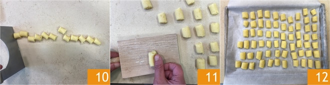 Coupez les boudins en morceaux de 2-3 cm 10, puis passez-les délicatement sur la planche à gnocchis 11 et disposez-les progressivement sur un plateau recouvert de papier sulfurisé 12. Vos gnocchis sans gluten sont prêts à être cuits et assaisonnés à votre convenance !