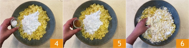 Ajoutez également le sel 4 et une bonne quantité de noix de muscade 5. Pétrissez à la main pour mélanger les ingrédients 6.