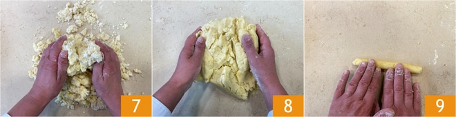 Transférez le mélange sur votre plan de travail et continuez à travailler 7 jusqu'à obtenir une pâte lisse et homogène 8. Enveloppez la pâte dans du film plastique et laissez reposer pendant au moins 30 minutes. Après le temps de repos, divisez la pâte en portions plus petites et étalez-les pour former des boudins d'environ 2 cm d'épaisseur 9.