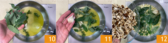 Assaisonnez avec les herbes aromatiques 10 et la gousse d'ail en chemise 11, puis ajoutez les pioppini 12.