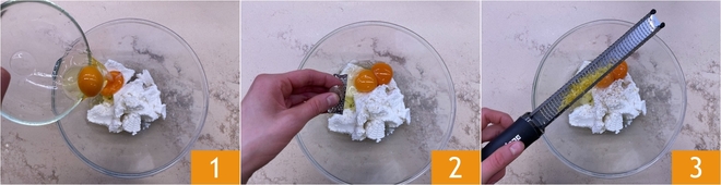 Pour préparer les gnudi de ricotta avec ragoût de légumes, commencez par la pâte des gnudi : dans un bol, versez la ricotta de brebis bien égouttée et les œufs 1, puis aromatisez avec la noix de muscade et le zeste de citron 3.