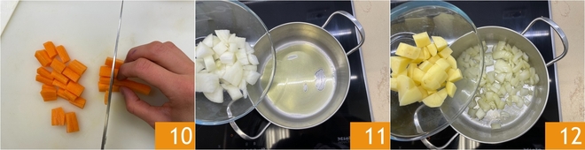 Faites de même avec la carotte 10. Dans une casserole, versez un filet d'huile avec l'oignon 11. Faites revenir pendant une minute, puis ajoutez la pomme de terre 12.