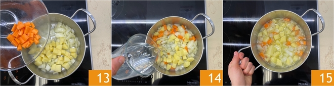 Ajoutez également la carotte 13, salez et couvrez avec de l'eau 14. Faites cuire pendant 30 minutes à feu moyen 15.