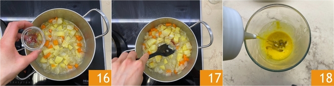 Lorsque les légumes sont cuits, éteignez le feu et assaisonnez avec les pistils de safran 16, puis mélangez bien pour qu'ils libèrent arôme et couleur 17. Transférez les légumes dans un pichet et ajoutez un filet d'huile 18.