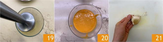 Mixez avec le mixeur plongeant 19 pour obtenir une sauce lisse et homogène 20. Réservez la sauce au safran et occupez-vous du ragoût de légumes : épluchez l'aglione 21.