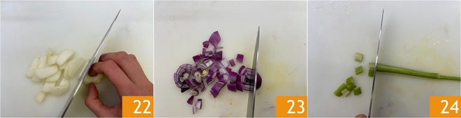 Coupez-le en tranches épaisses d'environ un demi-centimètre, elles ne doivent pas être trop fines 22. Nettoyez et coupez en dés d'environ un demi-centimètre tous les légumes : commencez par l'oignon rouge 23 et le céleri 24.