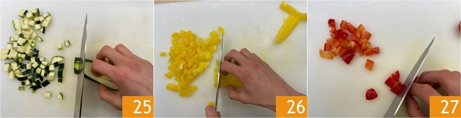 Poursuivez avec les courgettes 25, les poivrons jaunes 26 et les poivrons rouges 27.