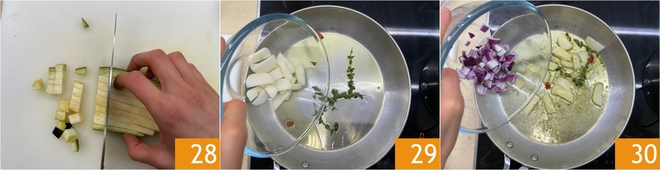 Enfin les aubergines 28. Dans une large poêle, faites chauffer un filet d’huile d’olive extra vierge avec l'aglione, un piment en morceaux et une branche de thym 29. Faites revenir pendant 3-4 minutes, puis ajoutez l’oignon 30.