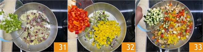 Après une minute, ajoutez le céleri 31, les poivrons 32 et les aubergines et faites revenir encore pendant quelques minutes. Enfin, ajoutez également les courgettes 33.
