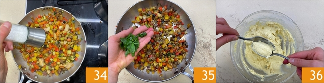 Faites cuire le tout pendant environ 10 minutes, les légumes doivent rester croquants. Salez seulement en fin de cuisson 34. Parfumez le ragoût de légumes avec des feuilles de basilic 35 et gardez au chaud. Maintenant, cuisez les gnudi : portez à ébullition une casserole d'eau salée, puis reprenez la pâte du réfrigérateur et formez des quenelles à l'aide de 2 cuillères 36.