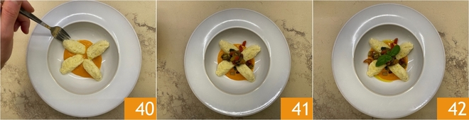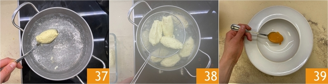 Plongez une des cuillères dans l'eau bouillante et utilisez-la pour faire glisser la quenelle dans la casserole ; ainsi elle se détachera facilement. Faites cuire les gnudi pendant environ 10 minutes, puis égouttez-les 38 et transférez-les sur un plateau ; avec ces doses, vous en obtiendrez environ 16, le nombre peut varier selon la taille. Vous êtes prêt à dresser : répartissez la sauce au safran à la base de l'assiette 39.
