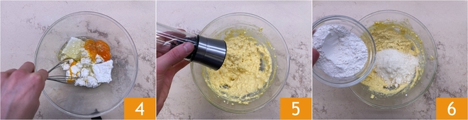 Mélangez avec le fouet 4 pour obtenir un mélange homogène et crémeux, puis salez et poivrez 5. Ensuite, incorporez le Parmigiano Reggiano râpé et la farine 6.
