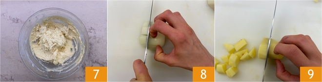 Mélangez à nouveau pour bien amalgamer le tout 7. Conservez la pâte au réfrigérateur et procédez à la préparation de la sauce au safran : épluchez et coupez l'oignon en morceaux 8, puis épluchez et coupez la pomme de terre en dés 9.